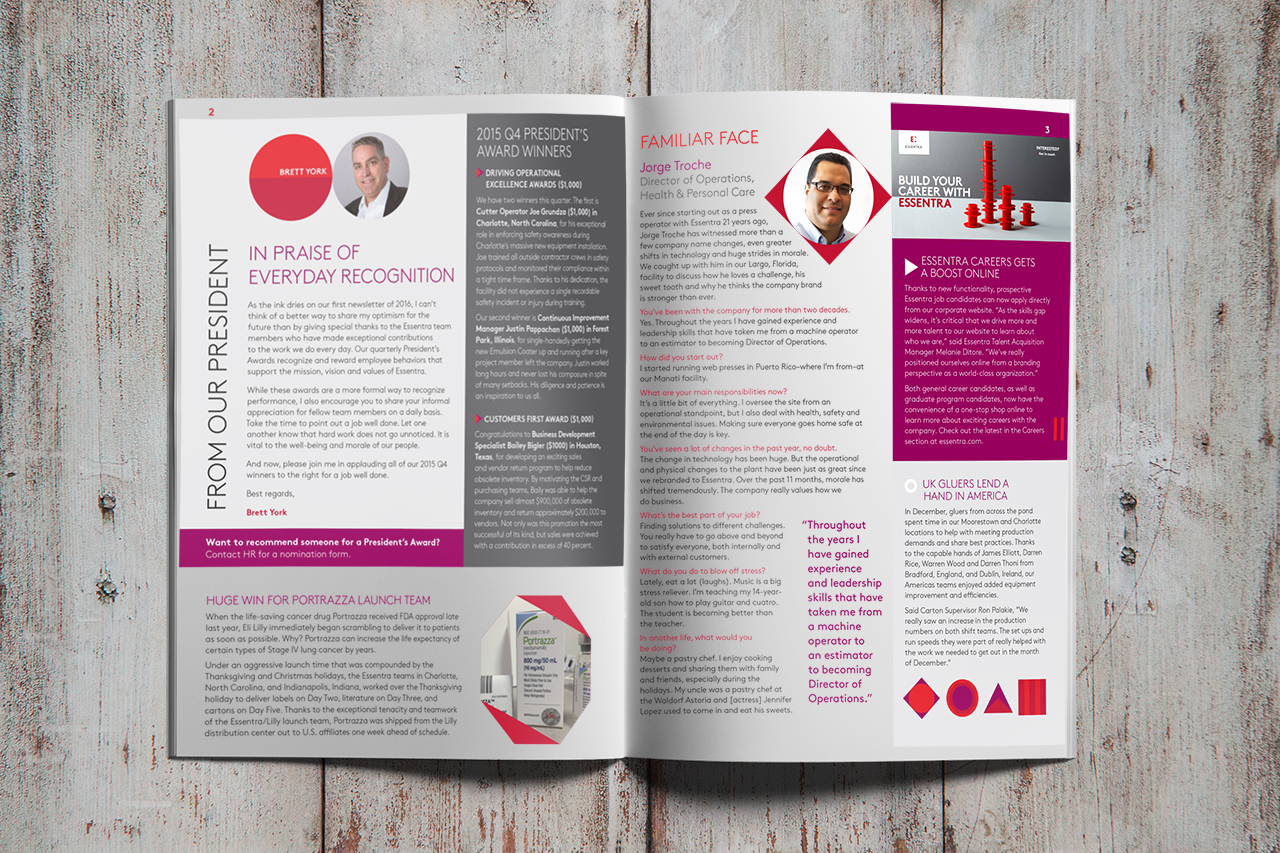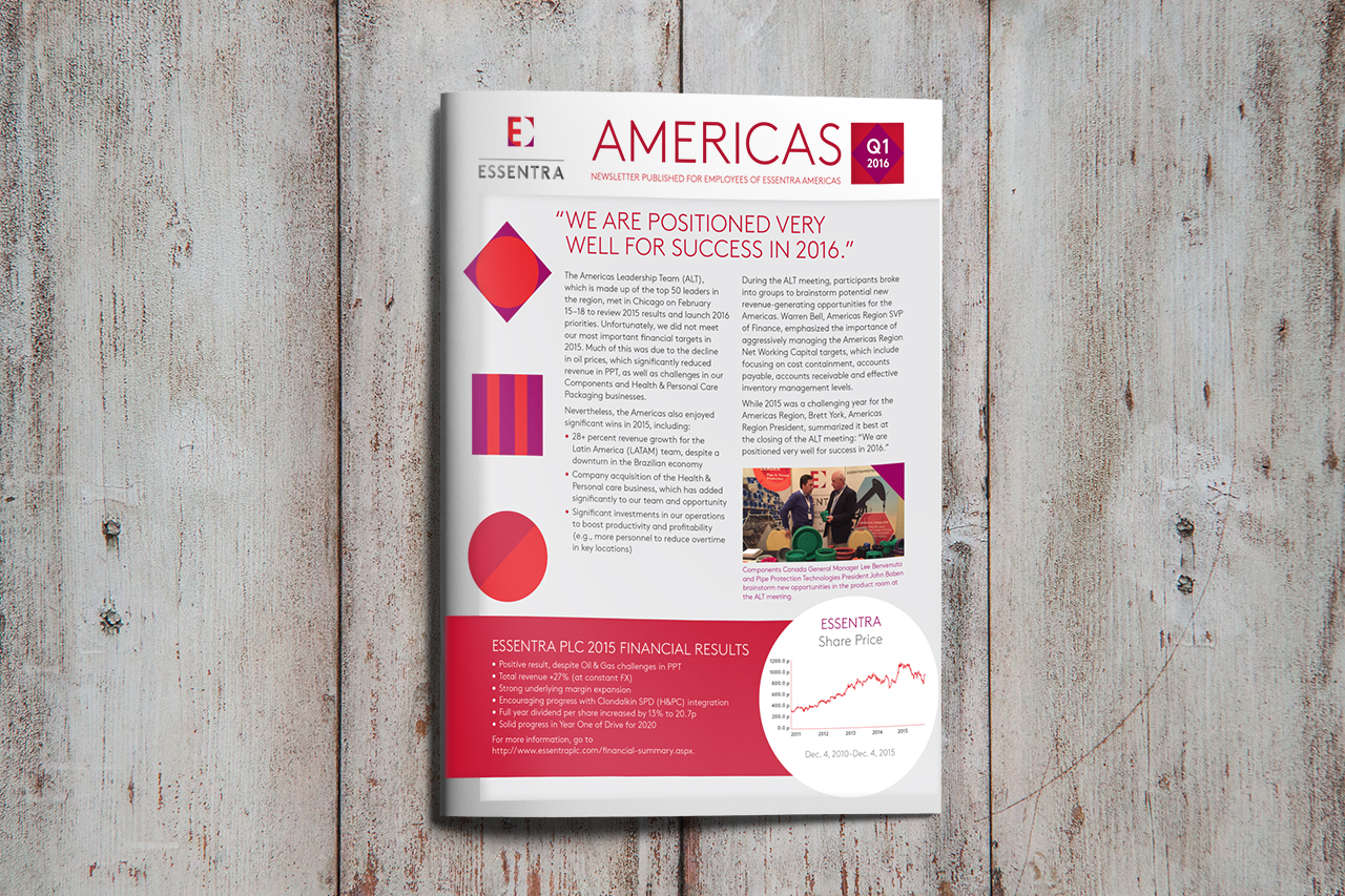 The quarterly Essentra Newsletter is a piece that we look forward to designing every year. By combining bold geometric shapes, rich shades of red, and regal purples with a clean, concise layout, this newsletter is as appealing to read as it is to look at!